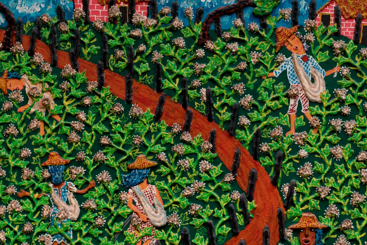 With a vivid palette and brimming use of pictorial space, da Silva’s depicts rural life in a way that resists idealization, revealing layered intersections of memory, landscape, and imagination. The scenes of labor and bountiful fields are populated with individuals who often disrupt their routines to do something else: to engage romantically, or to play. These moments provoke complex reflection on the field—not only as a site of toil but also as a place of disarming playfulness, idleness, burning desire, and even quiet subversion of the day’s expected order.